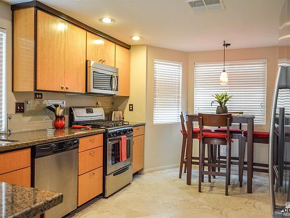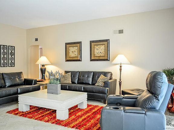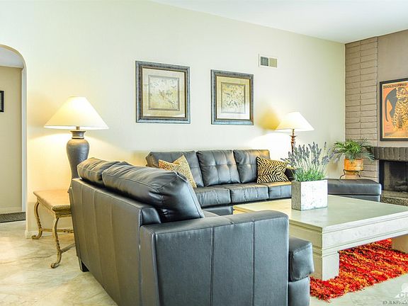 This such a perfect place with its convenient two car direct access garage, it is in a very lovely and well located neighborhood, it is on a little cul-de-sac, the setting is so wonderful and it is like living in a park but yet with lots of privacy and room to breathe. Attractively remodeled with a upscale modern kitchen, new windows, travertine look easy care tile, new showers, above counter sinks, custom window treatments and many other upgrades. It also has a beautiful outdoor living area with a retractable awning. Spacious green-belt, mountains and trees make up this wonderful view. Neighbors are a comfortable distance away and there is a completely enclosed and private front court yard. Tastefully furnished and located in the very nice neighborhood, Hidden Palms.