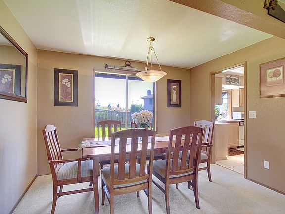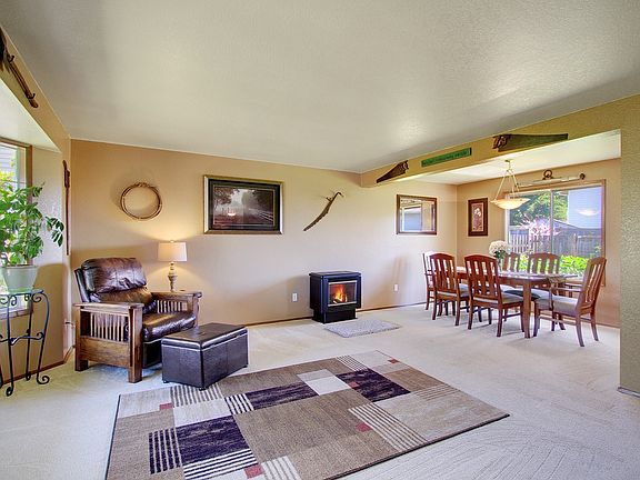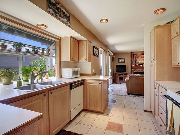 Open floor plans, filled with natural light. Bay window in Front Room; ceramic tile flooring in kitchen; gorgeous brick surround on wood-burning fireplace; free-standing gas fireplace in living room/dining areas; sunny garden window in kitchen; French doors off Master Bedroom lead to a private deck with amazing views. Spacious level lot for gardening; fully-fenced back yard, deck is perfect for summer entertaining. Easy access to Boeing & MORE!