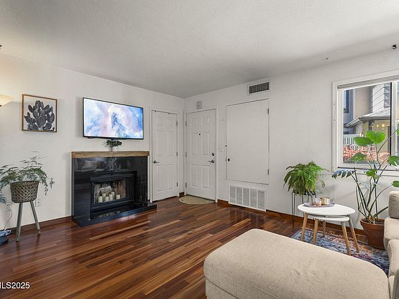 Stunning Corner Condo in Donner Springs! This beautifully remodeled corner unit is truly a gem! Step into a thoughtfully upgraded kitchen, featuring Thomasville cherrywood cabinets with pull-out shelves, stainless steel appliances, and Tigerwood flooring that adds a touch of luxury throughout. The Cozy granite fireplace is perfect for relaxing evenings and the custom master closet adds smart storage solutions. Enjoy natural light with new windows equipped with Up/Down window coverings, providing privacy and style. Step outside to your private patio, which opens directly to a peaceful waterway—perfect for morning coffee or evening unwinding. Plus, there's ample guest parking for visitors. Partial utilities included in the HOA; internet, cable, water, garbage, and structural insurance.