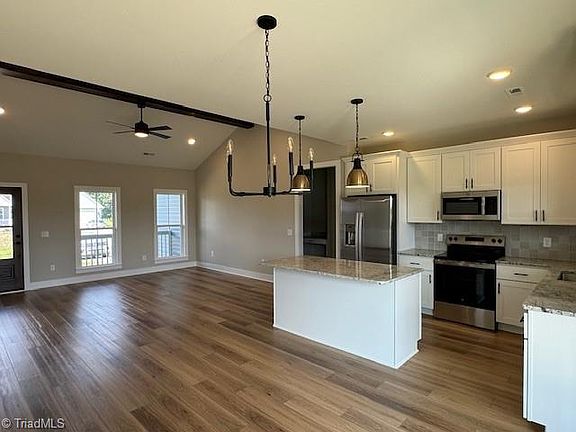 Welcome to your dream home in Climax, NC, only 3.4 miles from the Toyota Battery Plant! This stunning new construction boasts 3 spacious bedrooms and features a modern, open-concept design. The inviting living room is highlighted by soaring vaulted ceilings, creating an airy and expansive atmosphere. The chef's kitchen is a standout feature, complete with sleek GE appliances, shaker-style cabinets, and a spacious island ideal for meal prep and casual dining. The tile backsplash adds a touch of sophistication, tying the space together beautifully. The primary suite is a true retreat with a tray ceiling adding an elegant touch, and the en-suite bathroom offers a ceramic tile walk-in shower. The home also includes a huge laundry room, a well-appointed pantry, and a mudroom with a built in desk, ensuring ample storage and convenience. With its thoughtful design and high-end finishes, this home offers a blend of style, comfort, and practicality!