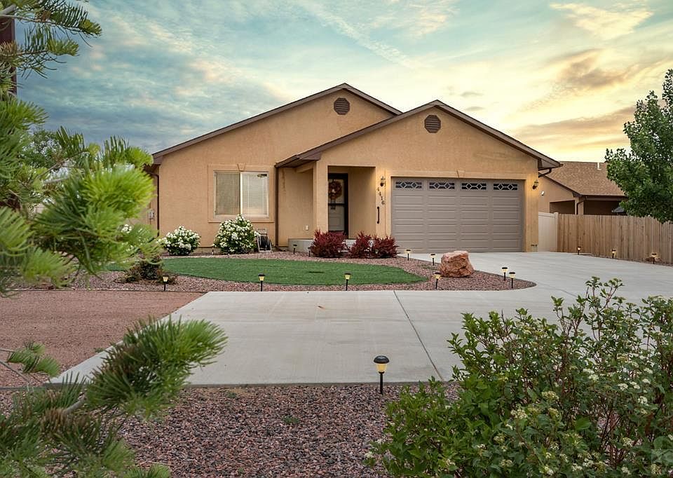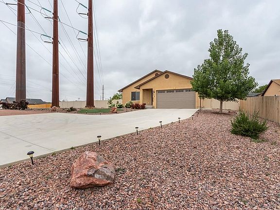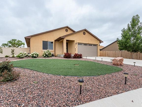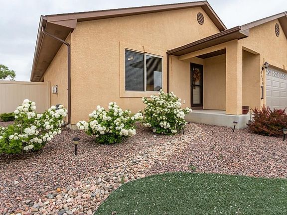 Homeownership pride, this home is like new! Open floor plan with vaulted ceilings, all main level living in this North side rancher. Featuring 3 beds, 2 baths and an attached 2 car garage. New flooring installed throughout. Large windows to bring in lots of natural lighting. Galley-way kitchen with ample amount of cabinetry and all stainless steel appliances included. Adjacent dining, opening up to the living room featuring a cozy fireplace. Nice size primary bedroom with its own ensuite bath with a walk-in shower. Washer and Dryer are included, washer is a double washer that features a separate washing compartment. Home sits on half an acre, 0.51, fully landscaped and completely fenced backyard! 35 different trees, various bushes, plants and flowers throughout the property. Combination of xeriscape, artificial turf, grass and lighted walkways making this a private oasis right in the city. Gate access to the backyard for RV Parking space. Large back outdoor covered patio, with views of Pikes Peak. Home is energy efficient with solar panels included, saving you monthly on utilities! Convenient location close to shopping, restaurants, with easy access to Hwy 50 West.