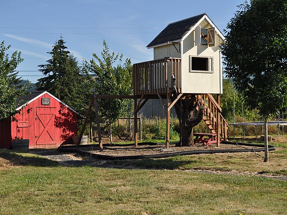 Cutest little farm house around. Spacious lot just under an acre gives you lots of room to run. Enjoy country living, but still in city limits and close to schools and town. Outdoor amenities include: a cute little red barn/chicken house, 2 story tree house with a wrap around deck, clear roof to see the stars and swings below.. also enjoy the huge 18' x 46' wrap around custom patio built with pavers. The house features a farm house feel with a modern appeal. 4 bedroom, 2 bath, heat pump, breakfast nook, knotty alder cabinets, tile, original hard wood floors, slate fireplace, covered front porch and more. A brand new 2 car garage, built to double as living space such as a man cave. Garage features a vaulted ceiling and attic space with pull down stairs, inset lighting, plenty of outlets and ready for your big screen t.v.