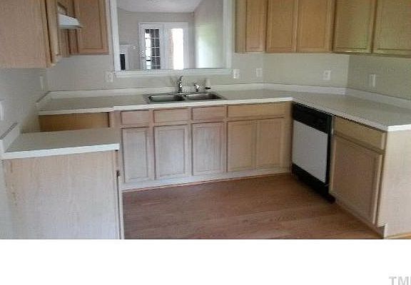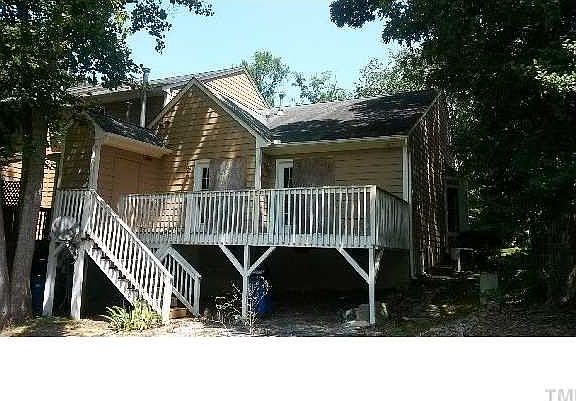 Convenient to I-540 & I-440! Beautiful end unit 2 bdm/ 2 full bth home!Kitchen has large eat in breakfast nook.Open floor plan with dining room connecting to living room that features gas log fireplace and hardwood floors. Cathedral ceilings in the living room and master bedroom with both rooms offering double glass doors to private deck. Master bath presents double vanity and enormous walk in closet. Private large back deck that steps down to a great patio garden. Home offers a storage room off of deck.