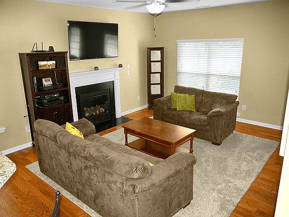 Rocking chair front porch w/stone accents welcomes you home! Open floorplan w/ HW floors perfect for entertaining. Gourmet kitchen w/custom cabinets w/crown molding, built-in wine storage, granite, SS appliances, tile bcksplsh, large island w/bkfst bar. Gas log FP w/mantel. Master w/trey ceiling, WIC. MBath w/dual sinks & marble vanity, ceramic tile. Ceiling fans in all bdrms. Tons of storage. Fenced bckyrd w/patio. Community pool & playground. Great location close to 540 & Buffalo Rd Park. Pre-Inspected!