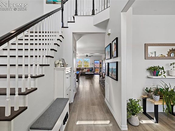 Enter this exquisite 5-bedroom, 3.5-bathroom two-story home that seamlessly blends comfort and sophistication. On the main level, you'll find a modern kitchen with high-end finishes, a spacious living area drenched in natural light, and a dedicated office space—perfect for those who work from home. Step outside onto the new composite deck to enjoy the tranquil mountain views, ideal for both relaxation and entertaining. The upper level features four bedrooms, including the luxurious master suite that features a large window offering a breathtaking, perfectly framed view of Pikes Peak, making it a true homeowner's dream. The walk-out basement adds valuable space with an additional bedroom, a large wet bar, and direct access to a second outdoor entertaining area. This versatile space is excellent for an in-law suite or as an Airbnb rental, offering flexibility and potential income. The 3-car tandem garage includes a workshop, perfect for DIY enthusiasts and professionals alike. Bright lighting and easy access make it an ideal setup for both automotive work and creative endeavors. Equipped with a radon mitigation system, this home prioritizes your health and safety. Nestled in D49 with easy access to all the Power's corridor has to offer, it's perfect for anyone seeking elegance and functionality.