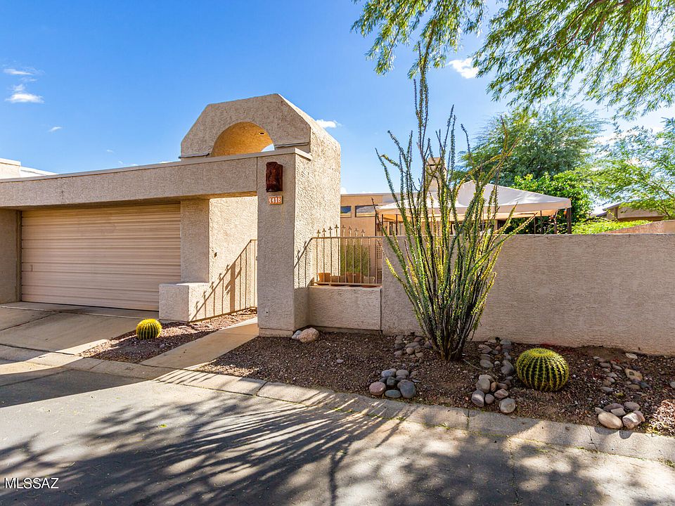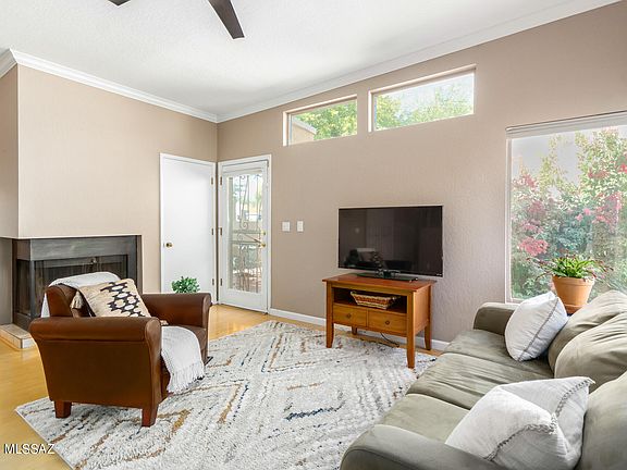 This light, bright & adorable 3 bed, 2 bath townhome is your perfect ''Lock & Leave'' or year round home. Located in a quiet, hidden & picturesque community, it's tucked away near The Loop Bike Path, Rillito River Park & River Walk. Enjoy the low HOA dues which include beautiful desert landscaping & a sparkling pool. The home's layout has a wonderful feel with a cozy fireplace in the great room, a split bedroom plan, lots of closets & direct access from the primary bedroom to the enclosed courtyard patio. Oversized 2-car garage w/ built in cabinets offers tons of storage space. Nature trails, grocery stores, restaurants, shopping & medical services nearby. ALL appliances are included! Roof recoated March 2022. Furnishings available on separate bill of sale. No rentals allowed.