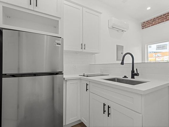 Cozy studio unitPrivate entranceStand-up showerStainless steel refrigeratorElectric cooktopOn-site laundry room