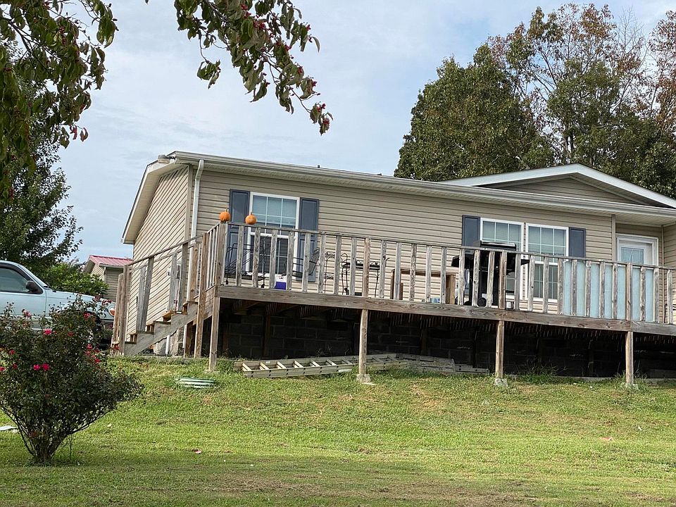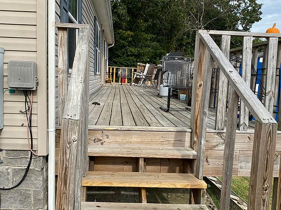 Large manufactured home with a large wooden deck on the front of the house. Home needs some TLC.