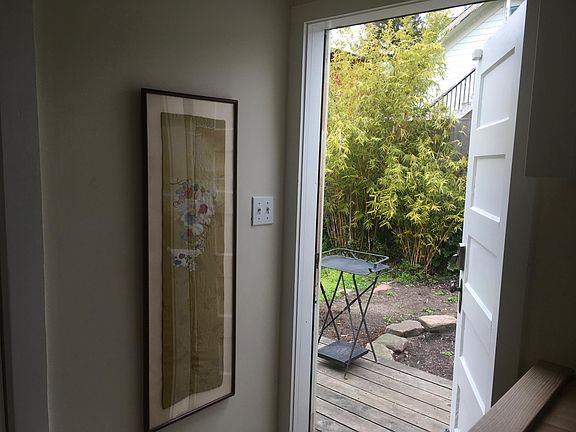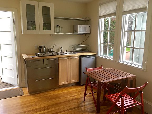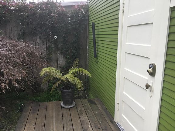 Available June 1st FOR ONE PERSON, no pets, for a minimum of three months. Bright garden studio in Temescal, entrance back of house Quiet street in trendy Oakland neighborhood. Walk everywhere - eateries, cafes, transport, shops, after the pandemic... Aesthetic and convenient space, professionally designed, elegant kitchenette and bath. Sparkling clean. Without the deck and bathroom, the space is 165 square feet (10.5x15) or 15.3 square meters. Access from the street is down the driveway, through a gate, up a ramp alongside my house, across a beautiful redwood deck to the entry door, no steps. Lovely morning light. Sit at a table on the deck opposite lemon and Japanese maple trees. The studio has what you need for a short-term stay, including furniture, bedding and towels, use of washer-dryer and a functional kitchenette. Kitchen counter has microwave, sink, electric kettle, and electric hot plate for simple cooking. Under-counter refrigerator. Dishes, cutlery, utensils. The shower is luxurious with on-demand hot water and good pressure. Three months minimum, one person. Rent includes all utilities, use of washer/dryer and wifi. Tenant sweeps walkway from back gate and area outside entryway.