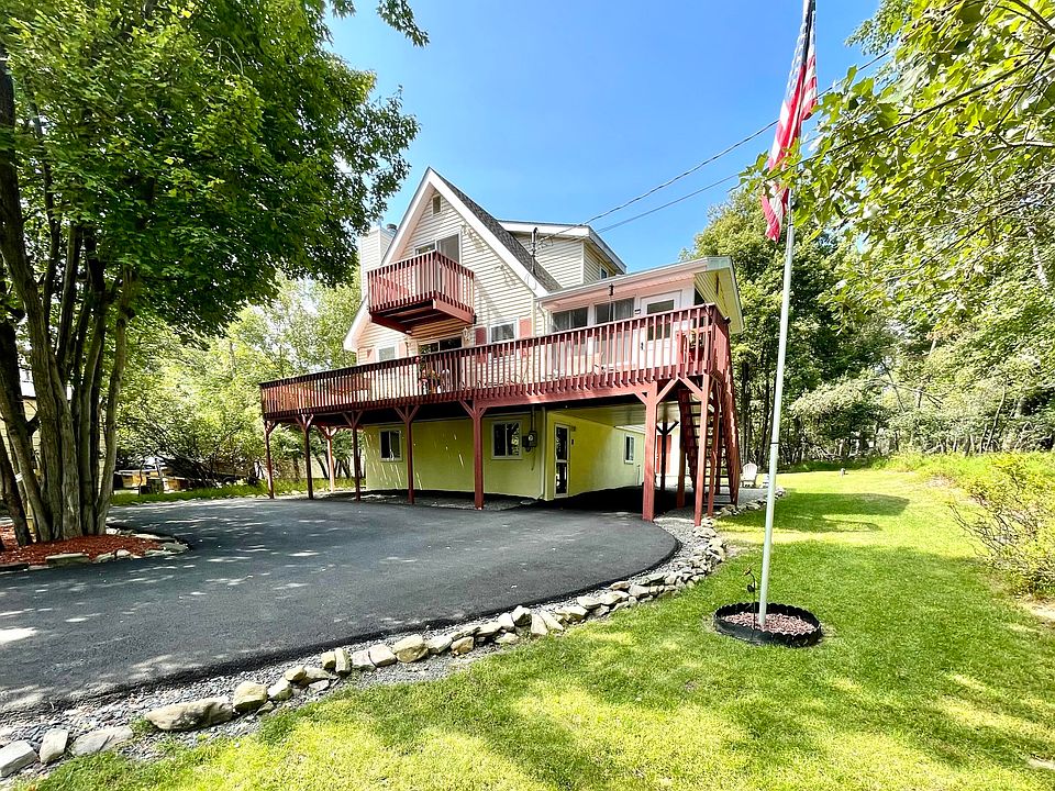 Meticulously maintained chalet in Emerald Lakes backing up to a greenbelt! What a beautiful property with so many upgrades including newer roof, new well pump and water heater, updated galley style kitchen with stainless steel appliances, radon system, professional grade dehumidifier, water softener system ,driveway pavement and many more. 3 nice size bedrooms, two full bathrooms, dining room/living room combo with a stone faced propane fireplace and partially finished basement with a propane stove make up this charming home. Additional bonus-detached garage, very pretty,low maintenance yard and a circular driveway! Perfect location and perfect property very close to all Pocono attractions. Come and fall in love with this home, do not wait to make your offer, it will be gone very soon!