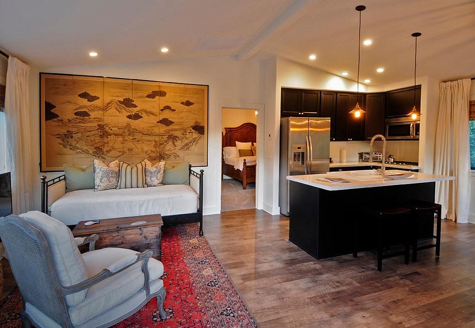 Fully furnished, month to month. 440 Crystal Springs Road. Firewire property that escaped the fire with just smoke damage, which is currently being remediated. Lots of defensible space, installed fire vents, generator and firewise landscaping. 850 square feet. 1 bed/1 bath. Interior designer's guest house with collected art, custom pillows, antiques and oriental rug. Fully outfitted kitchen with 5 burner cooktop and comfortable island. Beautiful views of the gardens, vineyards and mountains beyond. King size bed in bedroom, lots of closet space. Laundry in bathroom. Extensively landscaped gardens and seating areas. There are 2 more guest houses on the property, and each structure has exclusive use gardens and privacy. Bocce court that is part of shared space. Good wifi that can stream and accommodate video calls. $350/mo utility fee includes water, internet, direct TV, electricity, gas, and garbage service. Landscaping service provided by landlord. $450 one time cleaning fee upon move out. Twice monthly housekeeping at tenant's expense required. Available month to month.