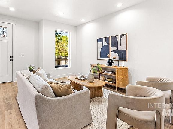 Introducing The Dayton at Molinari Park — a luxury townhome community set in the heart of downtown Eagle! Enjoy the ultimate walkable lifestyle just steps from Eagle’s premier dining, shopping, coffee shops, and nightlife. Thoughtfully designed with livability in mind, this home features 10-foot ceilings, wide-plank LVP flooring, and a spacious open-concept layout complimented with a warm, neutral palette. The kitchen features crisp white cabinetry, artisan square zellige tile backsplash, sparkling quartz countertops, and stainless steel appliances including a gas range. Upstairs, retreat to the private bedroom level. The master includes a private balcony, walk-in closet, and a beautifully finished en suite bath with a dual-sink vanity and frameless glass walk-in shower. Dedicated back entry 2-car garage. Live effortlessly at Molinari Park, where future on-site dining and coffee shops, lush landscaping, walking paths, a dog park, and an unbeatable location. PHOTOS SIMILAR.