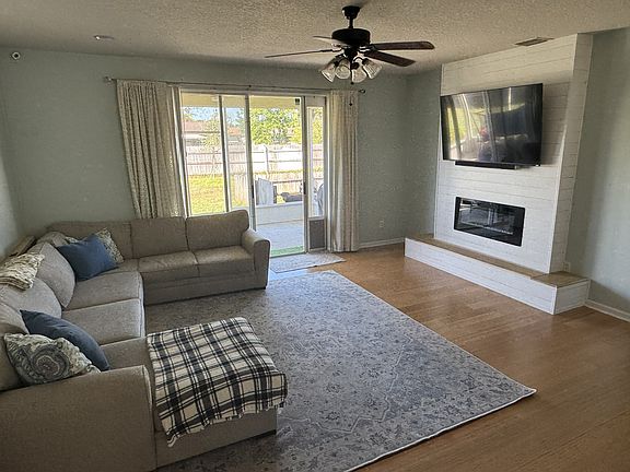 Open-Concept Living: The spacious living room is the heart of the home, featuring a stunning modern white shiplap fireplace with a TV mount, a ceiling fan, and large sliding glass doors that open directly to the screened-in patio.