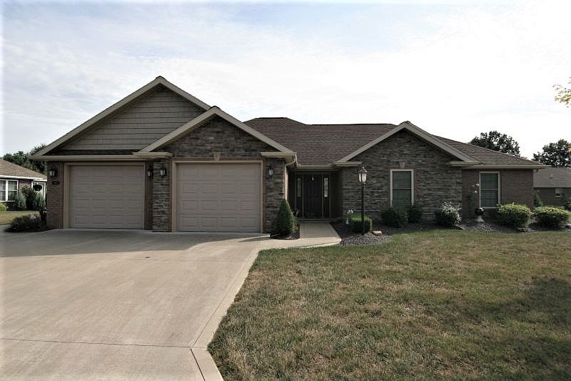 "Like New" describes this beautiful stone and brick exterior, 3 bedroom, 2 bath home located in Whispering Pines. Features include an 1851 sq. ft. open floor plan, wood and ceramic tile floors, and a gigantic master bedroom suite with a tiled walk in shower and twin sink vanity. Upgrades include stone counter tops, stainless steel appliances, an additional sun room and more. The exterior offers a 2 car attached garage and rear patio. Enjoy maintenance-free living while the Homeowners Assc. is responsible for the lawn care, landscaping, roof, and snow removal. This property is move-in ready and waiting for you.