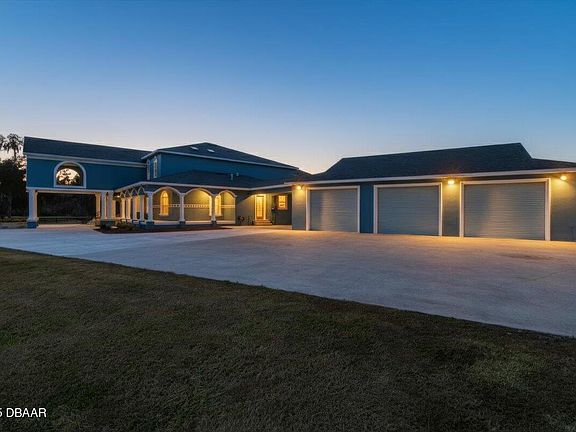 Step into refined country living in this breathtaking custom estate, showcasing over 6,400 square feet of beautifully designed interiors, nestled on 6.72 acres of meticulously maintained, fenced land. This energy-efficient home was designed with craftsmanship and comfort in mind, featuring 5 bedrooms, 5.1 baths, and custom touches throughout. The first floor showcases a spacious open layout with 3 large bedrooms and 4.1 baths, including a convenient pool bath. The gourmet kitchen is a true centerpiece, boasting custom maple cabinetry, a gas range with a 200-gallon tank, a large island, and a built-in breakfast area. Just beyond, the formal dining room, with tray ceilings, flows seamlessly into the family room, framed by elegant columns and French doors that lead to the lanai. Upstairs, a handcrafted mahogany and wrought iron staircase leads to an expansive loft or secondary living area. The owner's suite provides a serene retreat, complete with a private sitting area, a huge walk-in closet with convenient laundry space, and a spa-like tiled bath featuring a jetted tub and walk-in shower. Enjoy morning coffee from the private balcony overlooking the pool and manicured grounds. There is also a guest bedroom and a full bath on this floor. Outside, resort-style living awaits with a sparkling pool accented by waterfalls and a spacious travertine deck perfect for entertaining. Additional features include an oversized 3-car garage with 10-foot doors and skylights, an irrigation system, and a new roof installed in 2024. Located just 8 miles from historic downtown DeLand, this home offers the peace of rural living with easy access to city amenities. DeLand is renowned for its award-winning historic Main Street, thriving arts and dining scene, year-round festivals, and a welcoming community vibe. Residents enjoy top-rated parks, Stetson University, scenic state parks like Blue Spring and De Leon Springs, outdoor adventures, and major annual events. DeLand's blend of historic charm, cultural attractions, and proximity to both Orlando and Daytona Beach makes it the place to be for those seeking lifestyle, recreation, and investment value.