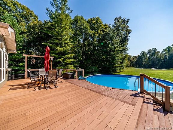 ABSOLUTELY INCOMPARABLE, totally updated, open-concept ranch on 21+ pristine acres available now in Charlestown! Expansive outdoor living space includes: multiple lounging areas, outside kitchen, outside fireplace, pool, fenced area (for your pets), and gorgeous lake with fountain feature. The home also has a massive, 4-bay detached garage (1 bay w/lift which stays with the home). The home provides privacy and convenience, surrounded by 17+ acres of hardwoods, but only 15 minutes to Louisville. 2 master en-suites are offered, high-end finishes throughout! Lower level could serve as a separate living space, or even an Air B&B with the 2nd master ensuite, and a family room which boasts a fabulous creekstone bar with adjoining billiards area. Amenities include: security system, an indoor/outdoor sound system, and new 10k Trane HVAC. This gorgeous home and magnificent acreage truly need to be seen to appreciate...schedule your private tour today!