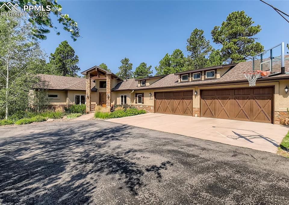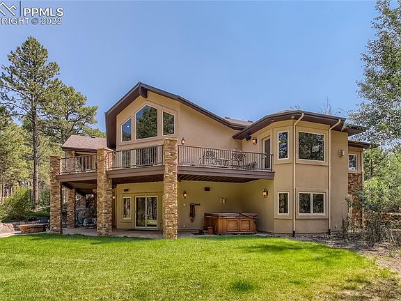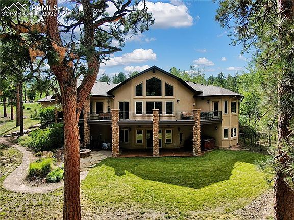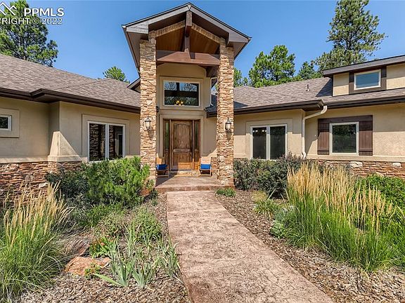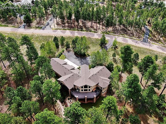 Welcome to a beautiful ranch plan in prestigious Cathedral Pines. Located on 2.51 acres and backing the open space Black Forest Trail system, this luxurious home features four bedrooms, dedicated office, five baths, formal dining, and amenities for the most discerning buyer. With gorgeous, old growth Ponderosa, but still lots of light, and easy access to Flying Horse, shopping, & entertainment, a perfect combination of country, quiet living & city conveniences. Also located in D20 schools. As you enter the home, a soaring wall of windows lets the nature come in a beautiful great room with floor to ceiling stacked stone gas fireplace, High vaults with wood beam beautiful wood accents, and leads out to a large composite covered deck overlooking the serene and very private land. With warm wood floors throughout the living, main level areas, formal & separate dining. The fabulous kitchen features Pro Style Jenn Air appliances, beautiful 42 in cabinetry, stone counters, lots of space, double ovens, plus roomy nook or hearth area. The large laundry space leads to an oversized, finished, heated four car garage with service door. The main level master retreat leads out to the deck and features its own stone gas fireplace plus two master closets & a spa like atmosphere five piece bath w/ radiant heat flooring. The walk out basement with LVP has 3 bedrooms, 2 with Jack/Jill bath and one jr suite plus a large family room with third gas fireplace and wet bar. A real treat is the theatre room (equipment stays) ready for viewing! The outside is as lovely as the inside with a gas fire pit for fun evenings. Other luxuries include 6 in trim with plaster lathe walls, amazing attention to quality and detail, instant hot water, bb goal, heated pipe so irrigation does not freeze in winter, wired for exterior lighting, fireplace outlet for decorative lighting, extra side parking. Amazing property with easy commutes to Springs and Denver