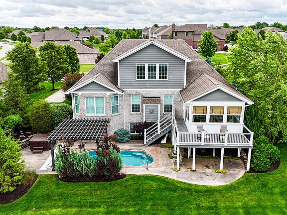 Welcome to this meticulously maintained custom home that offers unparalleled golf course living in a private, serene setting. Nestled along the fairway, the residence boasts expansive views and a thoughtfully designed layout. The main level features a spacious primary suite, complemented by a luxurious bath with dual vanities and custom tiled shower. The chef's kitchen showcases custom cabinetry, top-grade granite countertops, a double oven and large center island. Next to the breakfast space is the peaceful enclosed porch with all the natural light. Upstairs, a loft area leads to a custom entertainment bonus space with many uses while overlooking the golf course. The large finished basement boasts a theater and flex space as well as an oversized 4th bedroom. Additional highlights include a scenic deck with nearby gazebo, heated pool, and a 3-car garage. Located within the desirable Center Grove Community School District, this home is a true gem for golf enthusiasts and those seeking a luxurious lifestyle. Come and check it out today!