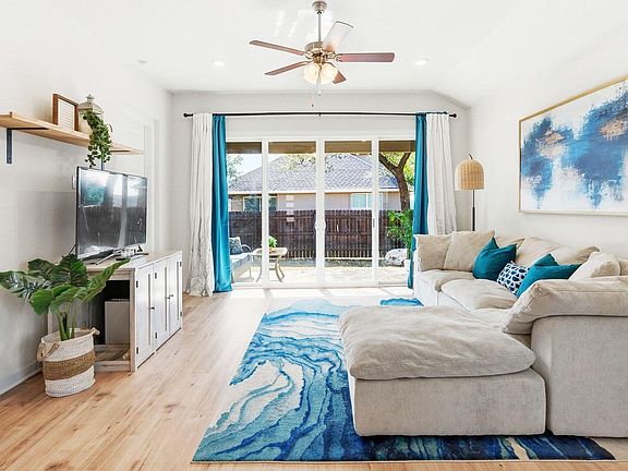 Beautiful single-story on a desirable corner lot in Lively Ranch. This bright, open 4-bedroom, 2-bath home features 10-ft ceilings, 8-ft doors throughout, recessed lighting in every room, and expansive living and dining spaces filled with natural light from numerous windows and an impressive 8-ft, 4-panel sliding glass door. The open kitchen offers white quartz Silestone countertops, soft-close cabinetry, generous storage, a large walk-in pantry, and reverse osmosis water filtration. The spacious primary suite includes a tray ceiling, a bright spa-like bath with seamless shower and garden soaking tub, and two large walk-in closets. Additional highlights include rare all-stone exterior construction for added energy efficiency, red oak built-ins, pre-plumbed water softener hookup, oversized covered front porch, and a large covered rear patio ideal for relaxing or entertaining. The home sits among four mature trees and offers a huge side yard, perfect for play or outdoor gatherings. Located just a 5-minute walk to Lively Ranch amenities including pool, splash pad, gym, playgrounds, trails, ponds, and outdoor grilling areas. Convenient access to 183 and I35, with H-E-B and restaurants nearby and Costco and Target just minutes away. Quiet street, friendly neighbors, and a thoughtfully designed low-light community where you can truly enjoy the night sky.