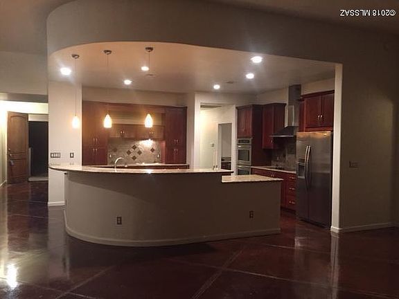 Beautiful home nestled in the Catalina Foothills with stunning city views. An open kitchen concept with beautiful cabinets, granite counter tops, lengthy breakfast bar and SS appliances. This open concept allows a great flow for entertaining and hosting friends in great room as well as dining area. French doors lead you out to the large covered patio, a crystal clear pebble tech pool with waterfall and ramada that makes for a great space to entertain. The flooring throughout is colored concrete and a Butlers Pantry is also a great bonus that could have many differnt functional options. By the way...make sure not miss the incredible storage in the 3 car garage ! A must see.