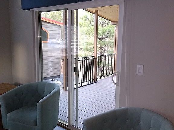 This is a 2021 Palm Harbor park model with addition is a total of 580 sf with another 300 sf of covered screened in porch. Original bedroom holds a queen bed. The addition offers a King bed plus half bath ensuite. Five ceiling fans. Fully furnished turnkey. Two TVs included; one in LR the other on the covered porch. Paver driveway with room for 3 vehicles. 80 SF storage room tucked under deck. Backs to HOA common area with unubstructed views of tall ponderosa pine trees. Drip system to all plants.