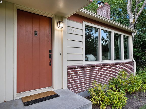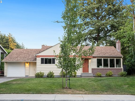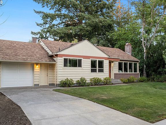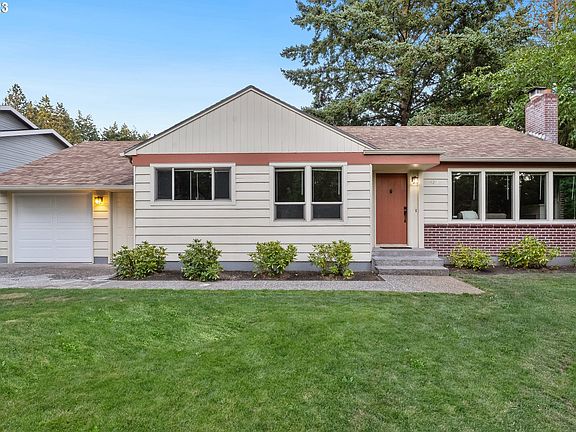 Turnkey remodeled 1940s ranch in West Slope! This home packs a punch with its open floor plan and more storage than you would expect. Perched on a quiet street and bordered by a wooded creek to the south and a park to the east, this home invites you to settle in and relax. Original hardwoods in excellent condition, a wood-burning fireplace, coved ceilings and plenty of built-ins exhibit period charm. Remodeled kitchen with large eat bar, granite counters, SS appliances, ample pantry, and separate dining space. Newer paint, large windows, and a meticulously maintained interior contribute to a sense of tranquility. The two bedrooms both fit king beds and one features a half bath en-suite. Oversized garage with exterior access to both front and back yards. Lots of space in the backyard for BBQs and entertaining this summer. Many updates in recent years include septic + oil tank decommission, underground electrical service, panel, updated plumbing, tuckpointing at chimney and brick veneer, drainage work, retaining wall added around crawlspace, newer vanity and sink in full bath, newer fireplace tile, and new concrete patio in backyard. Conveniently located close to shopping, transit, Nike, tech, parks, and the best of SW PDX/Beaverton.