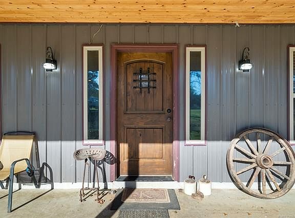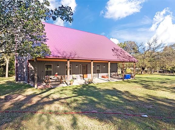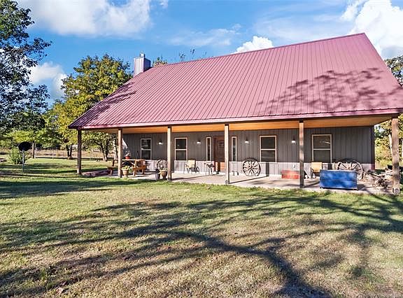 Metal ranch home on 40+/- acres! 2 bed, 2 private baths, & half bath. Concrete floors throughout first floor, wood flooring upstairs. Concrete counter-tops, custom wood cabinets in kitchen. Wood burning FP. Property features 3 pens w/ pipe & cable fencing, 3 lean-to sheds, 1 w/ electric. Barbed wire full & cross-fencing. 30x40 metal barn w/ electric, 6 horse stalls & 2 overhead doors. 40x60 metal shop covered RV parking space w/ electric/water hook-ups. Creek on property and pond. Fire hydrant on property
