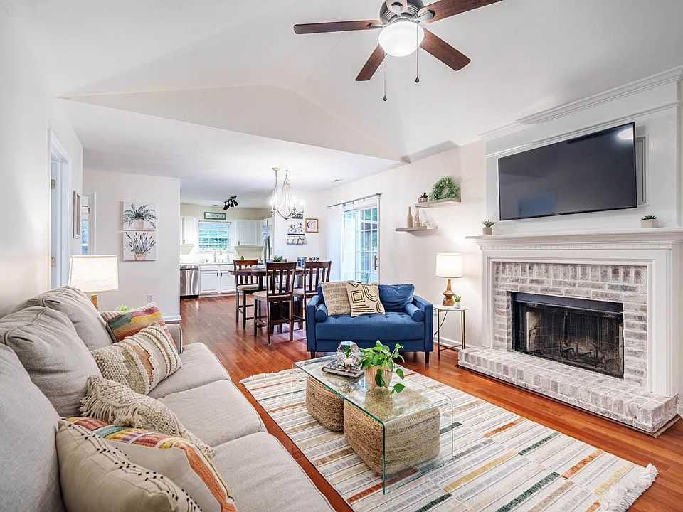 Adorable on Dolwick!  There is a lot to like about this sweet, conveniently located Hope Valley Farms charmer. Vaulted ceilings and a smart layout make this home feel spacious, but it'll still be easy to maintain at 1100 sqft.  When you walk inside, you're greeted by an open living and dining area, with a timeless brick-surround wood-burning fireplace.  Perfect for the cooler weather that is right around the corner.  Light pours in through the sliding doors off the dining room, which lead to your oversized deck.  A covered section and a grilling area extend your living space to the outdoors.  The kitchen boasts a huge walk-in pantry, newer stainless steel appliances, and abundant cabinet space.  The oversized primary suite has a large walk-in closet, bay window, vaulted ceiling, and gorgeous updated bathroom. You'll be conveniently located to all things Durham, RTP, and Duke, and soon, only a few blocks away from Durham's brand new elementary school. Enjoy the peace of mind of having a roof from 2019, HVAC and deck from 2020. All this for under $350k. Don't miss this one!