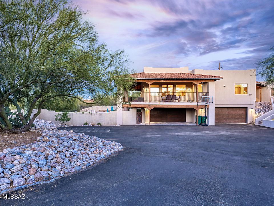 Mountain and city views surround this 5 BR, 4 BA, 4,035 Sq Ft Catalina Foothills custom home. Family and entertainment options are limitless with 4 bedrooms on the main floor and a 300 Sq Ft private Guest Suite on the lower level. Hickory cabinets, large island, breakfast bar, and stainless steel appliances complement the cook's kitchen. The Great Room provides ample space for large gatherings or family nights. Open the french doors to an expansive covered deck with city & mountain views, dining / entertainment / living space, and access to the resort backyard via the spiral staircase. At nearly 500 Sq Ft and direct access to the deck, the Primary Bedroom is incredibly spacious, yet comfortable and private. Views of the city and desert landscape provide intimate scenery and luxury. The see-through fireplace separates the Primary Bedroom and Bathroom and imparts a sumptuousness that is often only found at luxurious resorts. A jetted tub, large walk-in shower with dual shower heads w/ body spray, vanity with dual sinks, and sizable closet completes the Primary Suite.