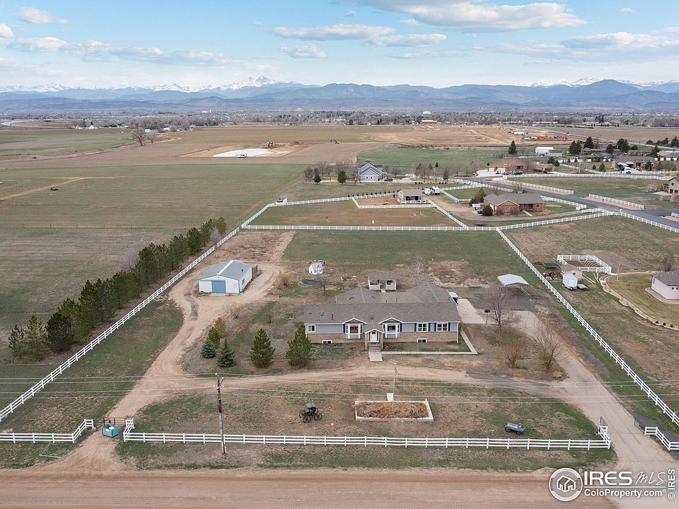 PRICE JUST REDUCED BY $200,000 FROM $1,200,000. Nestled in the serene countryside of Southeast Loveland, CO, this one-of-a-kind luxury ranch-style home offers the ultimate in Colorado country living with NO HOA. The sprawling 6438 square foot property boasts expansive mountain views and sits on three acres of lush, pastoral land, creating a private oasis of tranquility and serenity. As you step inside, the grandeur of this home is immediate, with soaring vaulted ceilings and stunning architectural details throughout. The spacious and open floor plan creates a seamless flow between the living spaces, making it perfect for both entertaining guests and enjoying quiet evenings at home. The open kitchen is a chef's dream, featuring hardwood cabinetry, ample storage, and an oversized island perfect for preparing meals or hosting casual gatherings. The luxurious master suite is a true retreat, complete with a spa-like ensuite bathroom, walk-in closet, and serene mountain views. In addition to the main home, this property also features a large heated workshop, ideal for light automotive or industrial work. The roof is brand new, as of 2022, interior paint is 2022. The expansive three-acre lot allows for endless possibilities, whether it's building a custom pool or creating an outdoor living space to enjoy the stunning mountain views. With no HOA to contend with, this property offers the ultimate in privacy and flexibility, allowing you to create your dream home without any restrictions. Impeccably designed and meticulously crafted, this property is the perfect blend of rustic charm and spacious modern luxury, offering a truly unique and unforgettable living experience. SELLER IS OFFERING A $10,000 CONCESSION FOR CARPET REPLACEMENT.