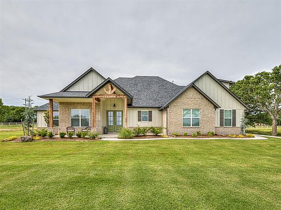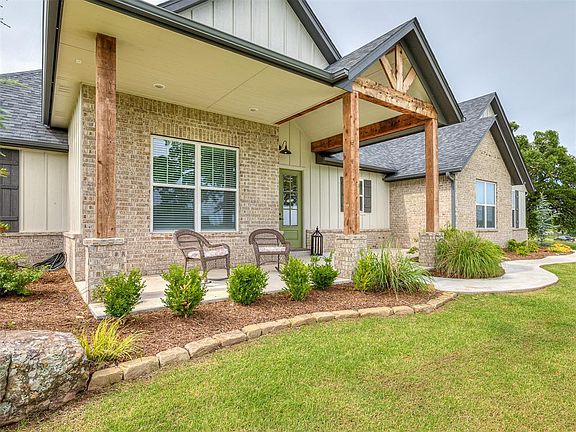 Stunning 4-bedroom, 2.1-bathroom home on 0.75 acres in Shawnee. The neighborhood exudes a quiet country feel while being conveniently close to all amenities. Beautifully landscaped, the property welcomes you with stunning trees as you drive in, with a charming front porch that’s perfect for serene sunset views. The interior boasts quartzite stone and neutral colors, creating a harmonious flow throughout the house, making it a truly perfect space with endless opportunities. Inside you’ll find a spacious open floor plan; the living room has a modern fireplace and large windows along the back wall, flooding the space with natural light and offering a stunning view of the backyard. The kitchen features a spacious island with bar seating, stainless steel appliances, and an amazing butler's pantry with abundant counter space, shelving, and storage. The master bedroom features a stylish tray ceiling and double doors leading to the luxurious master bath, which includes a large soaking tub, two separate vanities, a standing shower, and a spacious walk-in closet. Upstairs, a versatile bonus room with a closet provides additional living space. The covered back patio, equipped with ample overhead lighting and a ceiling fan, is perfect for relaxing and watching the wildlife that frequents the backyard. A back gate off the main road offers a convenient feature for adding a pool or shop without disturbing the front yard. Other features include an oversized 2-car garage and access to a picturesque pond for fishing. This home is ideally located, just a 5-minute drive from shopping, dining, and entertainment, and only 8 minutes to I-40. Don’t miss the chance to make this beautiful home your own!
