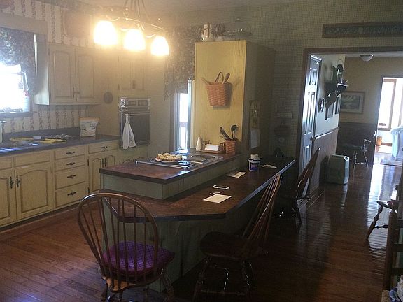 Two story cedar siding consisting of 11 rooms. Large kitchen with many oak cabinets and counter dining, wall oven, countertop cooking space. Separate dining room with outside entrance onto small grilling deck/porch. Living room with entry foyer and gas fireplace. Large masterbedroom with alcove for sitting or used as infant sleeping area. Two walk-in closets and master bath with under stairs storage. Sunroom overlooking 200 acre farmland with north and south entrance onto deck/porches. Also closed in under to make additional living space or storage. Tv room/rec area with half bath. Upper level as 3 lg bedrooms and large library room with small attic area. Bathroom with tub and shower. Two car garage and 12 x 15 lawn and garden storage. Old equipment storage barn with Cupelo and side shed. House has large covered porch on front with steps. Half basement for storage and laundry area.