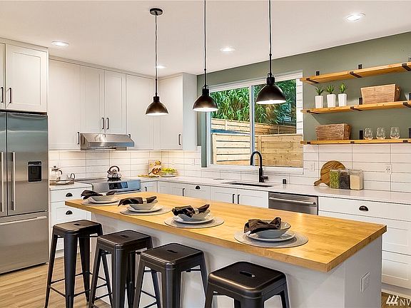 Beautiful detached townhouse built in 2018. Lovingly cared for and lived in by the owners. 4 bedrooms, 2.5 baths, open concept living, 1 designated parking spot and a spacious rooftop deck with incredible views of the mountains, SpaceNeedle and Ballard locks. This house is a green Built house with solar panels on the roof which dramatically decreases utility costs. This property sits on the border of Fremont and Phinney Ridge - a wonderful, friendly, safe neighborhood. Walking distance to shops and restaurants along Fremont Ave, Green Lake and Woodland Park Zoo. Only a couple blocks away from the best coffee shop in Seattle, Lighthouse Roasters!