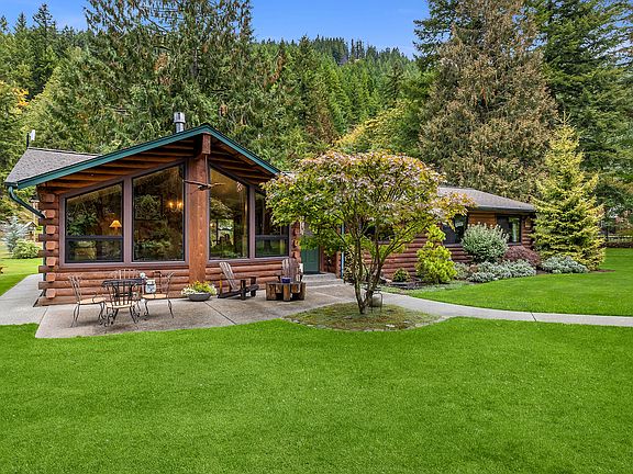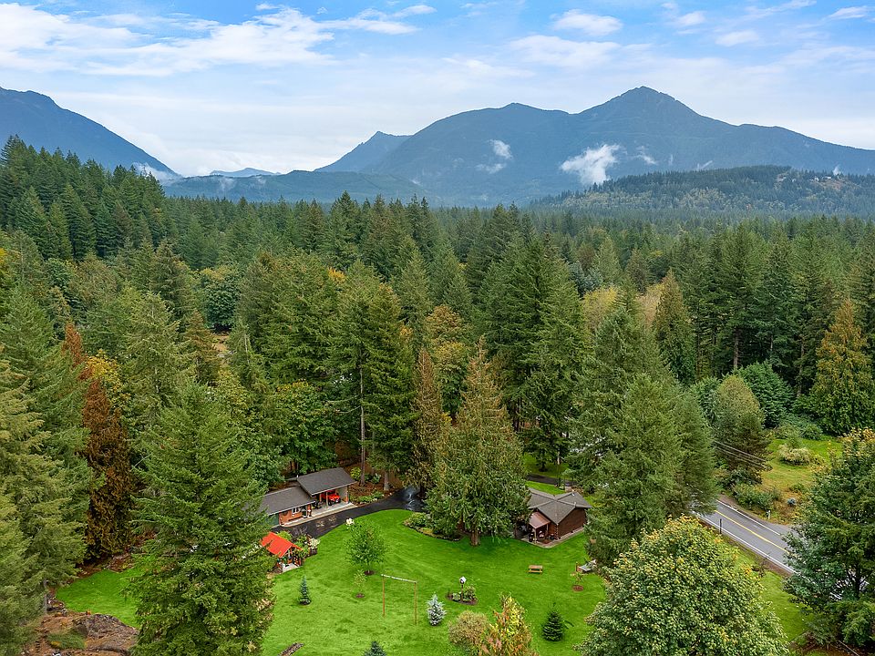 One of the most sought after streets in all of North Bend. Located just past the trailhead at the foot of Little Si, this stunning 7 acre property backs up to the mountain and is frequented by elk, deer and many wildlife species. The beautiful lodge style rambler is cozy and inviting and offers multiple outdoor living spaces to sit and take in the stunning landscape. A seasonal stream with bridge, a sand box, horse shoe pit, built in swing set, fire pit and outdoor dining and sitting area will make your jaw drop. Many outbuildings including a gorgeous greenhouse with outdoor tea garden, a huge 2 car detached garage with a shop that is unparalleled for the auto enthusiast or woodworker. Additional 2 car carport for all the toys. Must see!