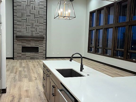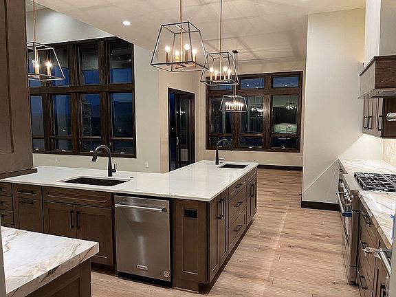 Floor to ceiling tile fireplace, gorgeous wood-beam accents to walls of windows lighting up the open floor plan. *Kitchen has a oversized L-shaped island with 2 sinks and built-in high-end appliances. *23'x18' covered rear patio. *Walk-in pantry next to kitchen *Sliding barn door leads you into a large master bathroom with heated tile floors, custom lighting around unique shower with full length bench that also serves as a faucet deck for soaker tub. *Double French doors in 12'x12' den/study next to spacious entry. *Large mud/laundry room off garage has many cabinets, lots of countertop area with built-in sink *Garden level basement includes: -3 bedrooms; one bedroom includes its own 3/4 bathroom and walk-in closet, the other 2 rooms have a Jack-n-Jill bathroom between -Large open family room with real rock fireplace -TV room has pool table area with full wet bar -Family room has computer area and 1/2 bath *4 heating and cooling zones throughout the home *Concrete fence to be installed Realtor inquires welcome. Call 307-235-6695 for more information or to schedule a showing.