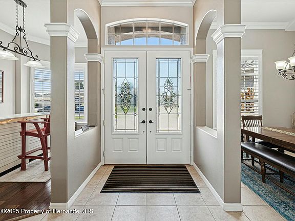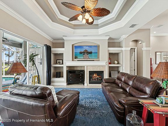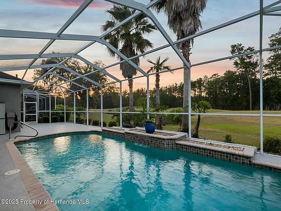 Welcome to this magnificent single-family home located in the prestigious gated community of Hernando Oaks. This beautifully maintained residence offers 4 spacious bedrooms, 3 full bathrooms, a 3-car garage, and a heated pool, all set on a picturesque golf course lot. From the moment you arrive, the paver driveway and elegant double glass entry doors make a grand impression. Step inside to a breathtaking view straight through the open-concept living room—featuring a gas fireplace, built-in shelving, tray ceiling, and triple retractable sliding doors that lead to an oversized screened lanai with a sparkling waterfall pool and sweeping golf course vistas. This home boasts a wide open floor plan with a dedicated dining area and a versatile flex room. The chef's kitchen is a dream, with an abundance of cabinets (complete with slide-out shelving), generous counter space, a cooktop, center island, and eat-in nook—perfect for entertaining or everyday living. High-end finishes include crown molding, plantation shutters, and engineered hardwood flooring throughout. The private primary suite is tucked on the right side of the home, offering dual walk-in closets, and a luxurious en suite bathroom with dual sinks, a vanity area, garden tub, walk-in shower, and private water closet. A guest suite at the back left of the home features its own walk-in closet and pool-access bath with a walk-in shower. Two additional front bedrooms share a third full bath with a tub/shower combo—perfect for family or guests. Enjoy peace of mind with major updates including a new roof (2023), HVAC system (2020), and water heater (2007). Exterior features include outdoor lighting and exceptional curb appeal. Community amenities include a professionally designed Scott Pate 18-hole golf course spanning 6,905 yards, a pro shop, restaurant, pickleball courts, and monthly activities—all just minutes from shopping, dining, and essential services. This is more than just a home—it's a lifestyle. Schedule your private showing today!