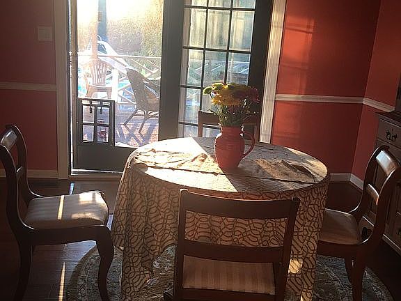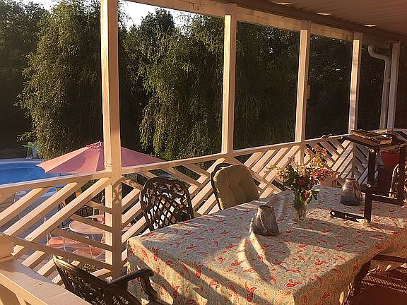 The upstairs has large windows throughout , swimming pool . The property is large with lots of room for parking , a large garden with access to nearby access to running water and a large spacious yard . The house is wonderful for entertaining large groups of people.