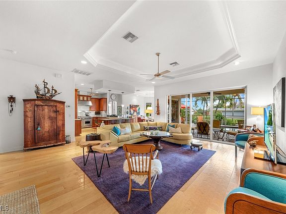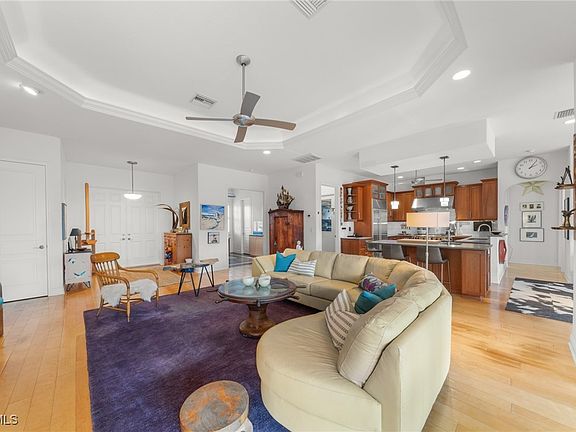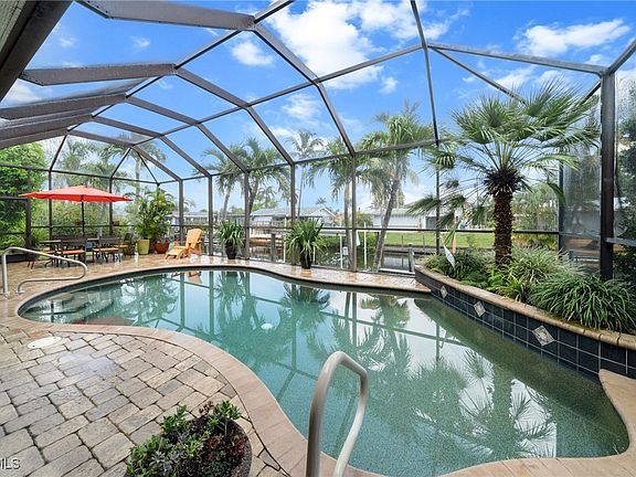 Tucked away on a quiet cul-de-sac, this custom-built, direct Gulf access pool home offers the ultimate in Southwest Florida waterfront living—with no bridges to open water and no compromises on quality or design. Spanning 2,257 square feet of living space, the four-bedroom, two-bath home features a spacious great room layout with rich wood flooring, 10-foot ceilings, and elegant tray accents. The home also includes impact-rated windows and doors. At the heart of the open great room layout, the island kitchen is outfitted for serious cooking and entertaining, featuring a built-in Sub-Zero refrigerator, Wolf gas range, wine refrigerator, walk-in pantry, and high-end finishes. Sliders and French doors open to the screen-enclosed pool area, where you’ll find a heated saltwater pool, outdoor kitchen, and a large under-truss lanai—perfect for shaded lounging and outdoor dining. The primary suite offers a private retreat with a spacious bath, including dual vanities, a walk-in shower, and a separate soaking tub. It is connected to public water and sewer, while the irrigation system runs on a separate well to keep the tropical landscaping lush and green. Additional upgrades include a 10,000-pound boat lift, a fenced backyard. Best of all, this home has never flooded—not even during recent hurricanes.