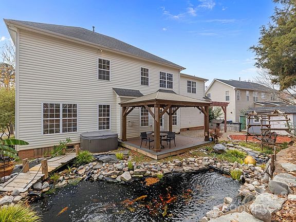 Outside, relax in your own backyard oasis featuring a koi fish pond, a hot tub, and a gazebo situated on top of the deck, perfect for year-round enjoyment.