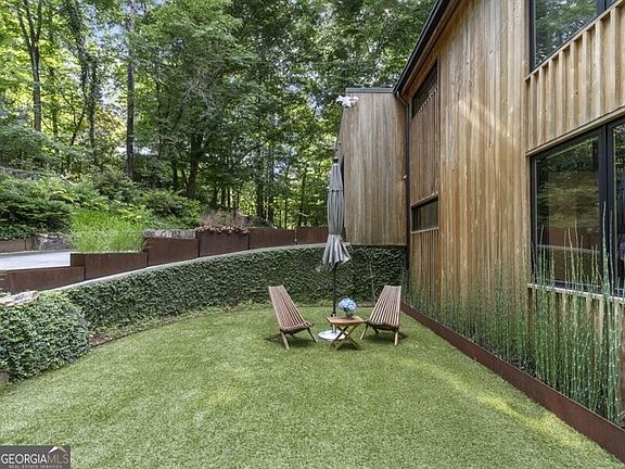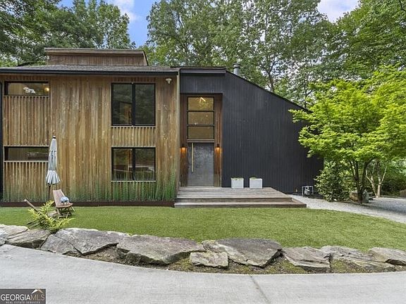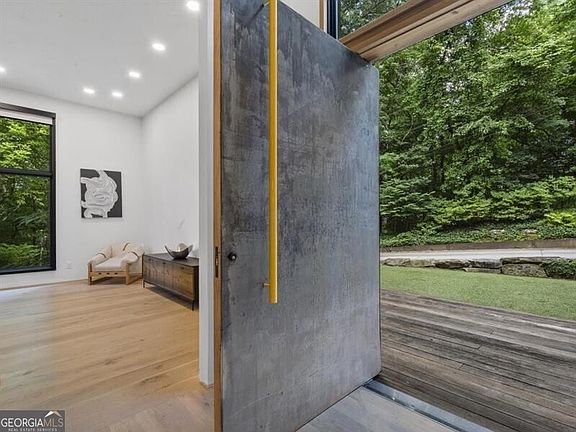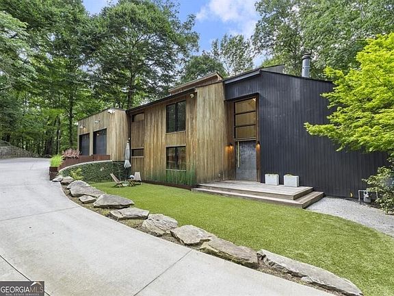 Stunning, partially furnished, Modern Home nestled among a gorgeous Landscape filled with Azaleas, Autumn Ferns, Japanese Maples, Dogwoods, and Live Oaks. Guests are welcomed through a uniquely designed Wood and Steel Door into an Open Floorplan. Designer Kitchen featuring attractive Custom Cabinetry with Concrete Counters, Stainless Appliances, Island Breakfast Bar, Built-in Storage and Open Shelving. Spectacular Family Room with a soaring ceiling, recessed lighting, massive windows equipped with mechanical shades, and slate Fireplace. Also included on the Main Level are Two Offices, Guest Bath, and multiple sliding doors opening to a wrap-around rear Deck to enjoy the fabulous setting with peaceful stream perfect for any type of entertaining. Upper level features the Primary Suite with lovely natural light, casement windows, and a tranquil private Deck. Sophisticated Bath with dual Vanity, Shower with a Steel and glass partition wall, stylish finishes, and walk-in customized Closet. Two additional Bedrooms with shared Bath, and spacious Laundry Room. Lower Level features an additional Bedroom, Bath, and Flex Room perfect for a Home Gym, and Recreational/Media Room with recessed lighting, and outdoor access to a charming pebbled Terrace with stone steps. Unique lighting, ironwork, mechanical shades, and hardwoods throughout. Two-car Garage including an electric Charging Station. Neighborhood sidewalk creating easy access to the Polo Fields, Chattahoochee River, Shopping, Restaurants, and Nature trails. Minutes to Vinings Village and Interstate access. Home is currently occupied and requires a 48-hour notification to show BY APPOINTMENT ONLY with Realtor subject to approval by Tenant. Copyright Georgia MLS. All rights reserved. Information is deemed reliable but not guaranteed.