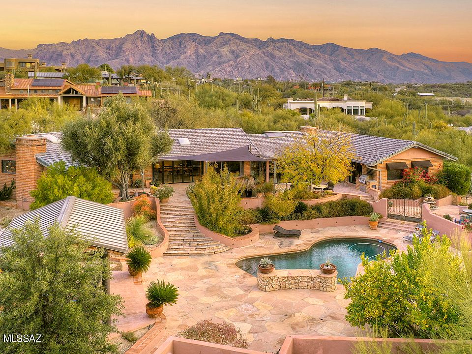 Foothills Gem. Luxury living at its best at this Hacienda Del Sol estate. Sense a feeling of refinement before you ever step foot inside. From the fenced courtyard w/mature landscaping you enter through glass & iron front doors to the foyer w/beautiful travertine floors & venetian plaster walls that usher you toward the comfortable living room, kitchen & breakfast nook. The southern area of the home is filled with natural light from the bench windows & retractable glass walls that open from Kitchen & Dining room onto the terraced backyard for indoor/outdoor living. Throughout the entire home massive, exposed beams & vaulted wood ceilings create an organic feel, especially in the living room with its natural stone fireplace. Amazing family room off the dining & living room creates SEE MORE An amazing living space off the dining room & living room creates an environment for entertainment or relaxing w/programmable lighting & easy access to the pool & covered outdoor outdoor grill. The other end of the home features the primary suite w/stained-glass window, bench window seat & walk in closet. Large primary bath w/dual vanity, separate jetted tub & 5 head shower leaves nothing to be desired. Three more spacious bedrooms and two more full baths give you space & privacy. A short walk through the beautifully multi-level backyard leads to the separate guest house that shares the elegant finishes of the main home. Guest house ideal for extra space w/office/living area, bedroom, bath, kitchenette & private outdoor living space. Resort style backyard features award winning pool by Whitaker Pools, outdoor ramada w/fireplace and outdoor grill ideal for entertaining. Tranquil feel w/waterfall & mature desert landscape perfect for moments of solitude. Outdoor fireplace and several other areas for entertainment, conversations or relaxing. Plenty of room on this 1.39-acre lot to enjoy the Sonoran Desert lifestyle all without an HOA! Architectural details like burnt adobe construction, cement tile roofing & the interlocking paver driveway let you know this is truly special. A climate controlled 2 car garage, lots of extra parking space & two private entrance gates in both the front and back of the property add functionality & privacy. Originally built in The 1960's, the home has a great amount of history. The perfect foothills location, city views & one of a kind architecture all combine to make this house something you must see to appreciate. The sense of tranquility while still being minutes from downtown, dining & entertainment is just one of the fabulous aspects that makes this home a gem in Tucson's Catalina Foothills!