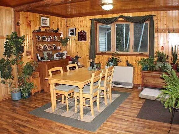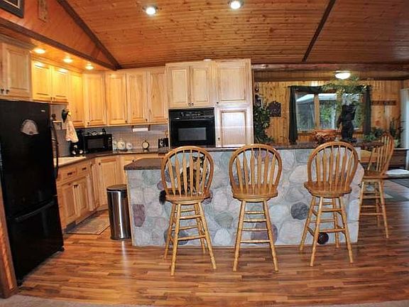 PIONEER HOME WITH WORKSHOP & GARAGE -Sweet deal in the woods! This Northwoods style home with tongue and groove throughout has an open concept that you are looking for. The kitchen has all the upgrades of a more expensive home with custom rock kitchen island,double oven, gas stove top in the counter, island accented by stone and beautiful Hickory cabinetry.Outside the sliding glass doors you are welcomed by flower beds that have blooming flowers each season, perfect as you enjoy the large covered gazebo-your outside living room. The privacy and quiet will be impressive, as will be the trails thru the 5.8 acres all the way to the county land that abuts it, making it easy to jump on the ATV trails and enjoy hunting-yes, the permanent tree stands are included. There is a garden shed, a lean-to plus a huge heated garage/shed. Half is designated for garage and half is cabinet lined workshop and office. Many new updates. Pioneer Lake is just down the road + Just 3 minutes off Highway 45.