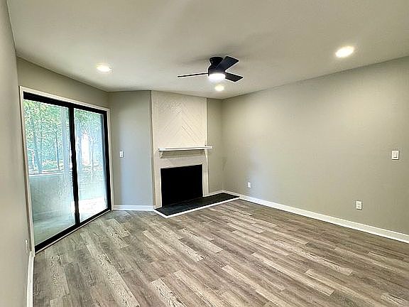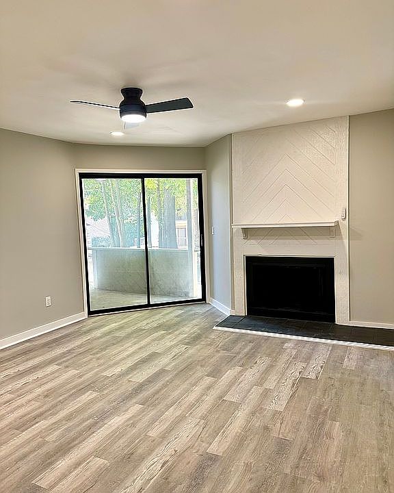 This home is ready to move in and features fireplace in living room with updated mantle and ceiling fan. Kitchen has new quartz countertops and freshly painted cabinets. New LED lighting throughout, new outlets and switches. Washer and dryer hookups in the apartment. Access to the private porch from both the living room or the bedroom. Condo comes with one assigned parking space.