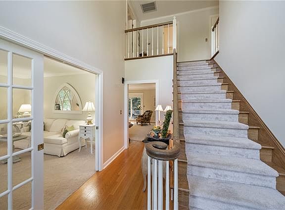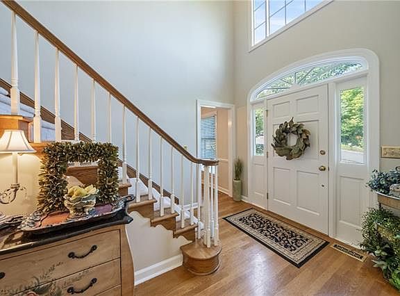 Spacious four bedroom home in Moore's Ferry with views of Lake Hickory! Enjoy main level living with soaring two-story foyer opening onto formal living and dining rooms, and an inviting family room with built-ins, fireplace, and exit to the rear deck. The oversized kitchen has plenty of cabinet storage, stainless appliances, center island, breakfast area, and rear hallway with laundry room, double garage, and private guest bedroom suite. Upstairs, you'll find three additional bedrooms, including a master suite with lake views, private bath, and walk-in closet. Convenient walk-in attic storage, and partial basement with exterior entrance for additional storage. Quiet, cul-de-sac location with winter views of Lake Hickory's main channel. Very energy efficient home! Moore's Ferry amenities include gated security, clubhouse, pool, boat launch, marina, and more!