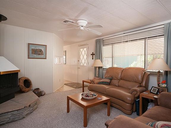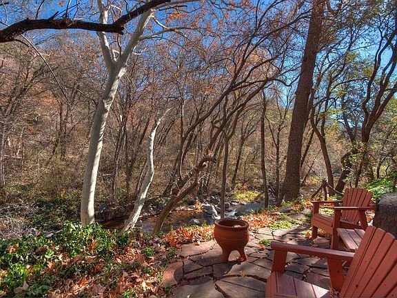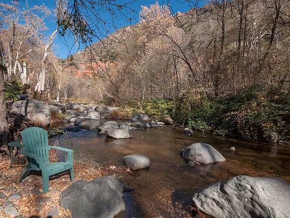 Come relax to the serenade of the tumbling waters of Oak Creek. This community borders the creek, which borders national forest service on the east boundary. This 55+ community park offers a private gated entrance, convenient mailbox area, and a variety of park benches to enjoy one of the most beautiful, natural settings in all of Oak Creek Canyon. Just across the street is the easy access down to 623 ft. of creek frontage. The towering sycamores and gigantic trees are home to a variety of birds including the Blue Herons that fish in the creek below. Most of the furniture MAY be included with the EXCEPTION of the bar in the carport, the TV, and personal items. There are gutters over the carport and three electric plugs for your convenience. Looking for a place to unwind, come call this your home!