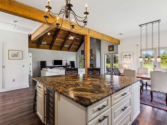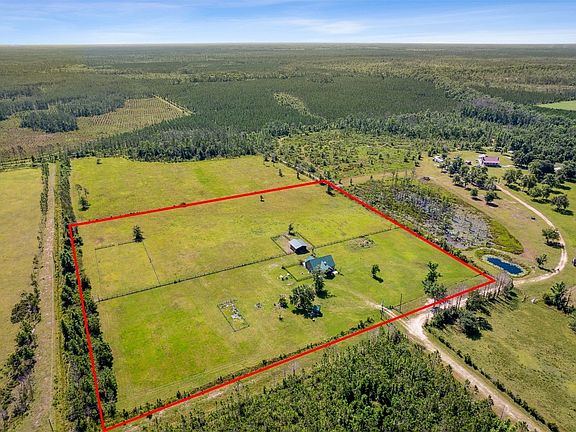 Discover the epitome of country living in this stunning custom-built home, perfectly situated on over 10 scenic acres. This thoughtfully designed residence features 2 spacious bedrooms and 2 bathrooms. The heart of the home is an open kitchen and living area, highlighted by a striking Brazilian granite kitchen island with wine fridge and storage as well as a professional-grade 6-burner gas range, perfect for culinary enthusiasts. The home's exterior boasts charming cypress siding, a durable metal roof with a whole-home generator ensuring peace of mind and uninterrupted comfort and all the room you need for RV/boat storage or additional structures. Inside, you'll find soaring cathedral ceilings with tongue and groove cypress and sleek vinyl plank flooring. Each bedroom has French doors leading out to a private patio. You'll fall in love with the owner's 5-piece bath with walk in shower, double vanities and clawfoot tub. Equestrian lovers will be thrilled with the exceptional horse facilities on the property. The well-appointed barn(24X24) has a metal roof, gutters and includes two stalls(12X12) with separate paddocks, a tack room, and a feed room, providing everything needed for top-notch horse care. Additionally, the property features a Menege(120X200), making it ideal for training and exercising horses. The property is fully fenced and home has roll down hurricane shutters for the French doors and Bahama shutters for the windows for added peace of mind. Embrace a lifestyle of tranquility and elegance in this remarkable property.
