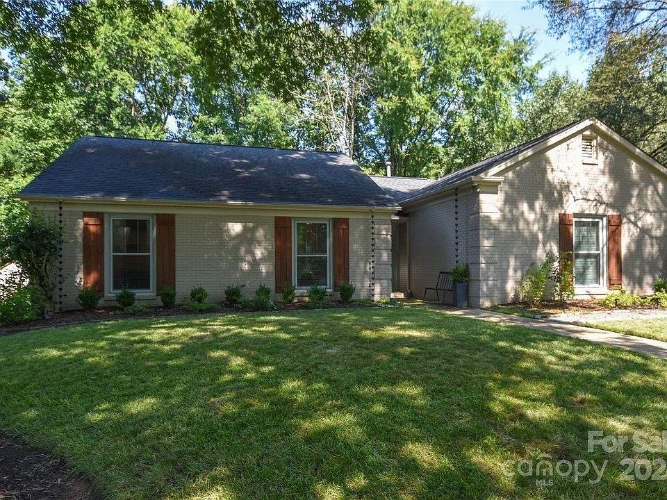 Charming, fully updated 3 bedroom, 2 bath ranch home in the highly sought after Downs Grant subdivision which adjoins Raintree. This all brick home sits on a private corner lot and has been lovingly maintained. Excellent condition and updated inside and out, this home is a MUST SEE. Since 2016, new roof, triple pane windows, new paint (interior and exterior) custom drop zone, stainless kitchen appliances, quartz kitchen countertops, dry bar, blinds, new high end LVP flooring and premium carpet, recessed canned lighting, new light fixtures, newer exterior doors, updated screened porch and deck, new privacy / split rail fencing, new crown molding in 2024 and more. The home boasts vaulted ceiling in the living room with exposed architectural beams and walk-in pantry. Short walk to private park with walking trails and new playground. A "must see" property in a great South Charlotte location close to excellent schools, shopping and easy access to I-485.