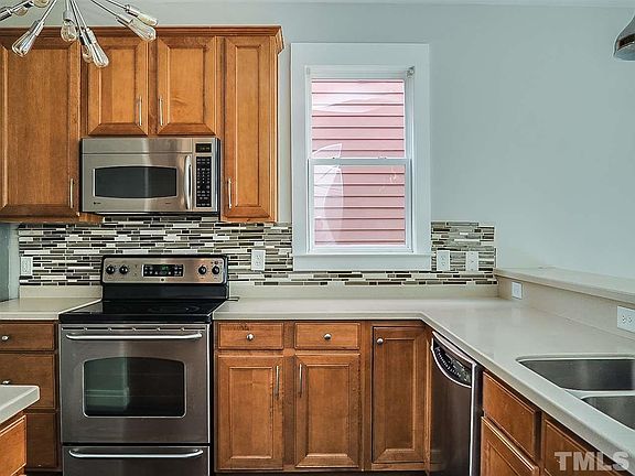 Built in 2005, this Raleigh three-story is located in a well-kept neighborhood and offers stainless steel appliances, a fireplace, and a patio. Upgraded features include fresh interior paint and new carpet in select rooms. A community pool, tennis courts, and a playground are part of the HOA.