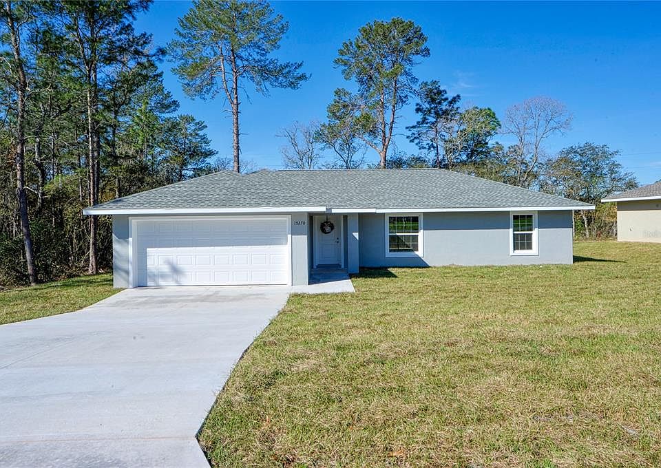 Under Construction. Beautiful NEW home in Marion Oaks! As you enter the home you will find an inviting and open floor plan with cathedral ceilings in the large Living room, dining area and eat in kitchen all done in attractive neutral colors. Luxury Vinyl Tile throughout all living and common areas and carpet in bedrooms. Upgraded Stainless steel appliances, wood cabinets and luxury laminate countertops, pantry and large center island are some of the top features in this open kitchen. Stainless steel microwave is included. Beautiful ceramic tile in both bathrooms. Master bathroom has a full shower with all tile and it beautifully done! Spacious master bedroom with walk in closet. Inside laundry room. Large patio in the backyard. Construction is almost completed and will soon be ready for move in. Pictures are of the same model previously completed but home will be very similar. This home is quality built and you will love the layout. The builder has several color palettes so photos show some of each.