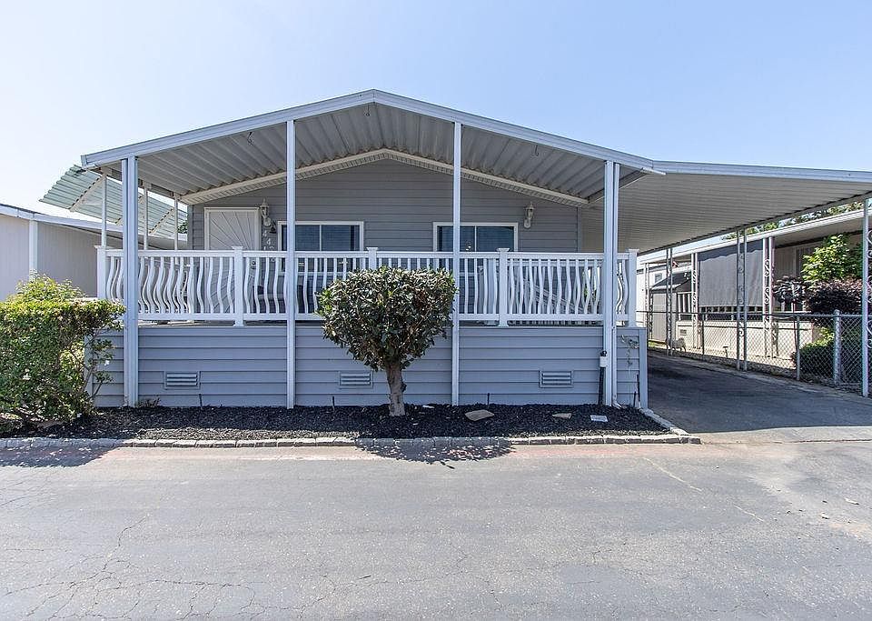 Welcome to Dry Creek Mobile Estates! An ALL AGE mobile home park! The park offers its own community pool and park included with space rent. This home offers a spacious open floor plan of 1,344 sqft, 3 bedrooms and 2 baths with inside laundry hookups. There are many updates to make this home move in ready. With updated flooring, dual pane windows, updated kitchen with newer cabinets, updated appliances with a gas stove, carpet in the bedrooms, both bathrooms updated, paint, electric plug in fireplace, newer AC and water heater. The backyard with a shed is a blank canvas just waiting for its new owner(s) to make it home! Don't miss your chance to live in this desirable mobile home park located in Modesto!